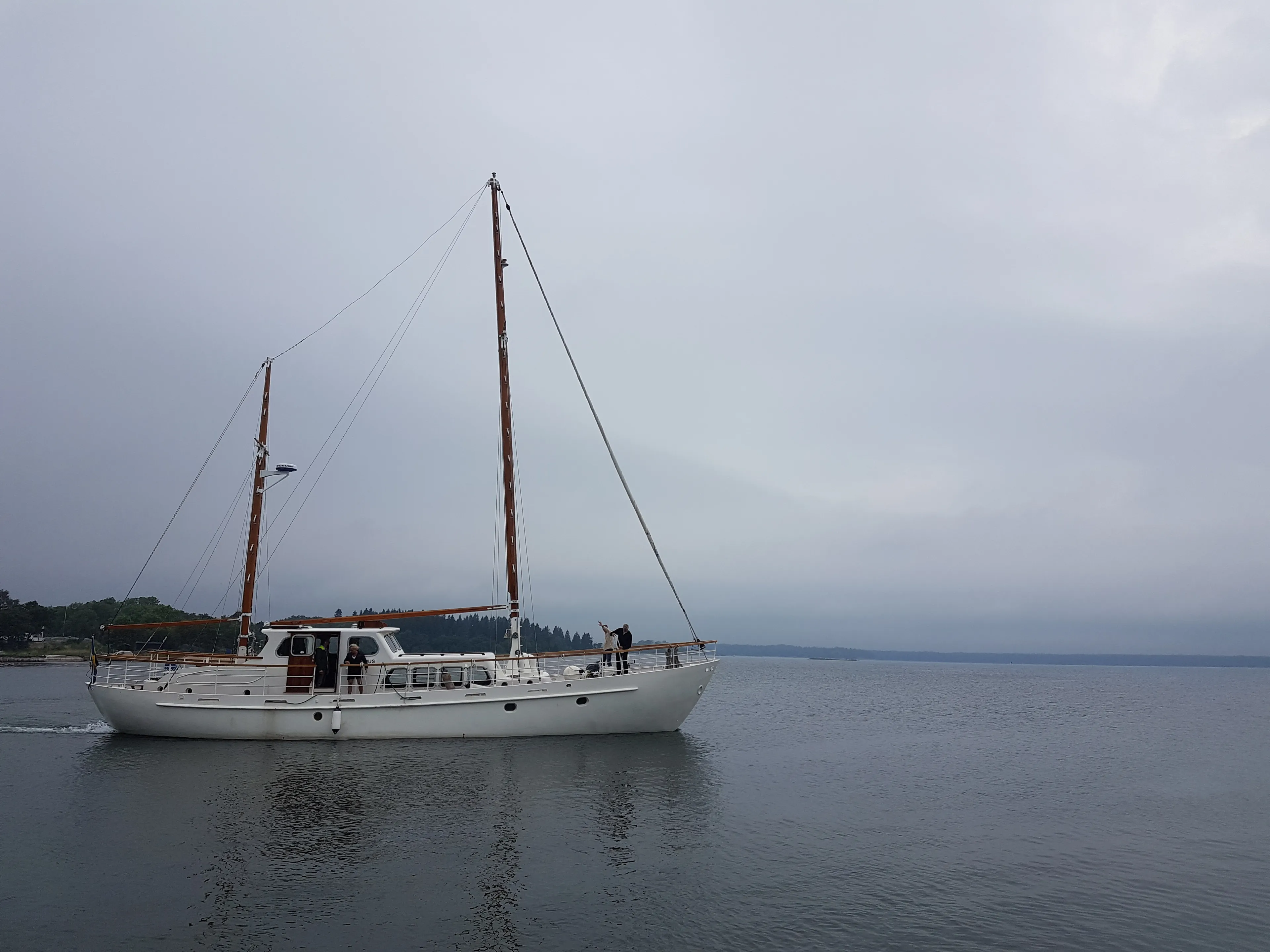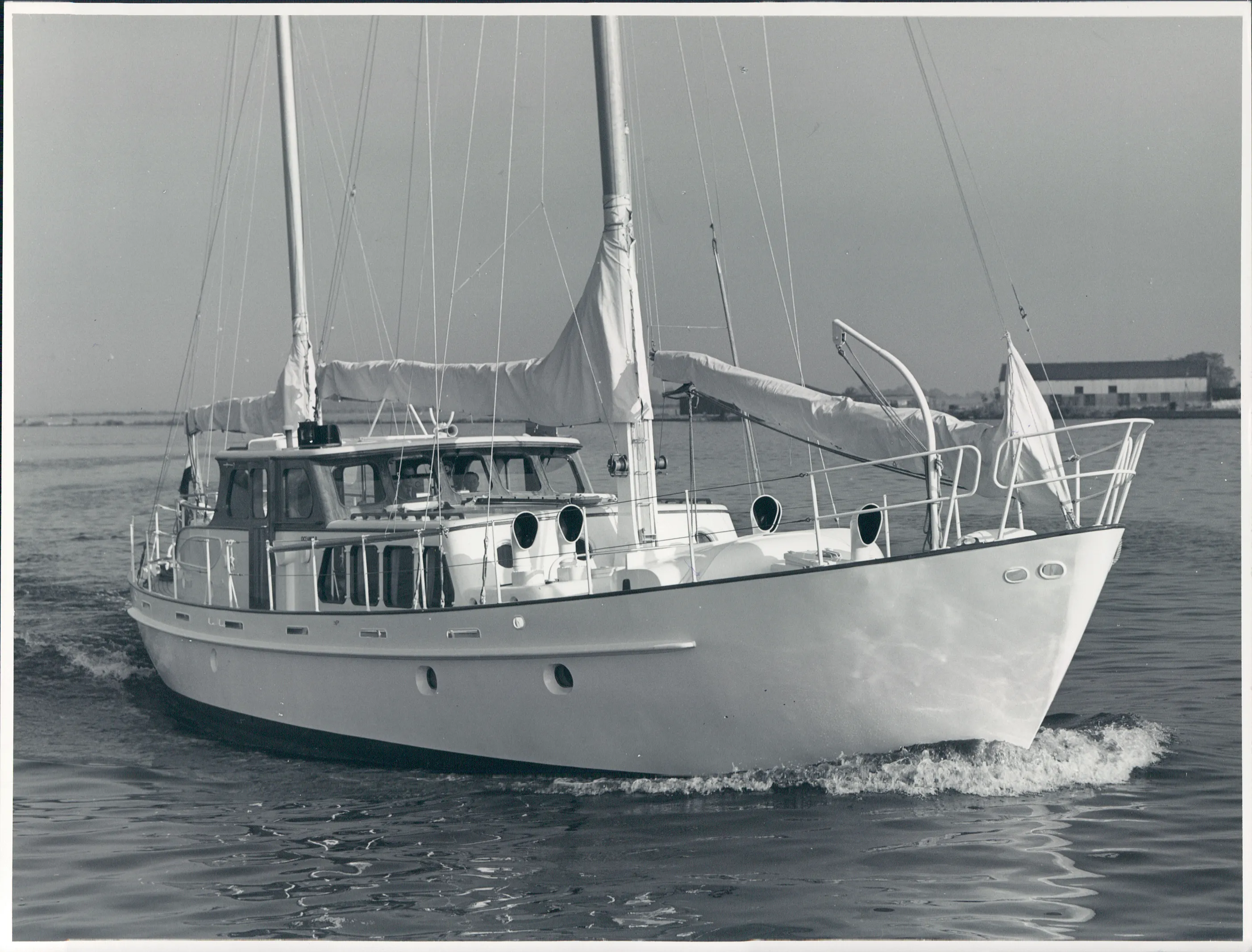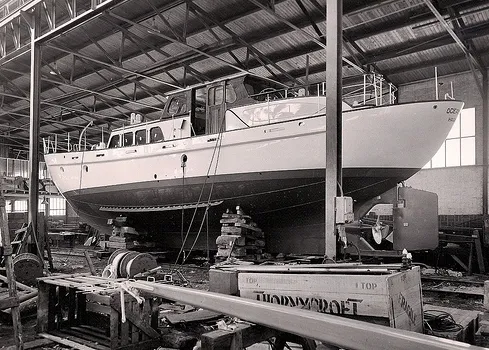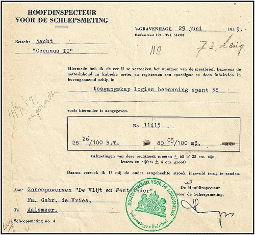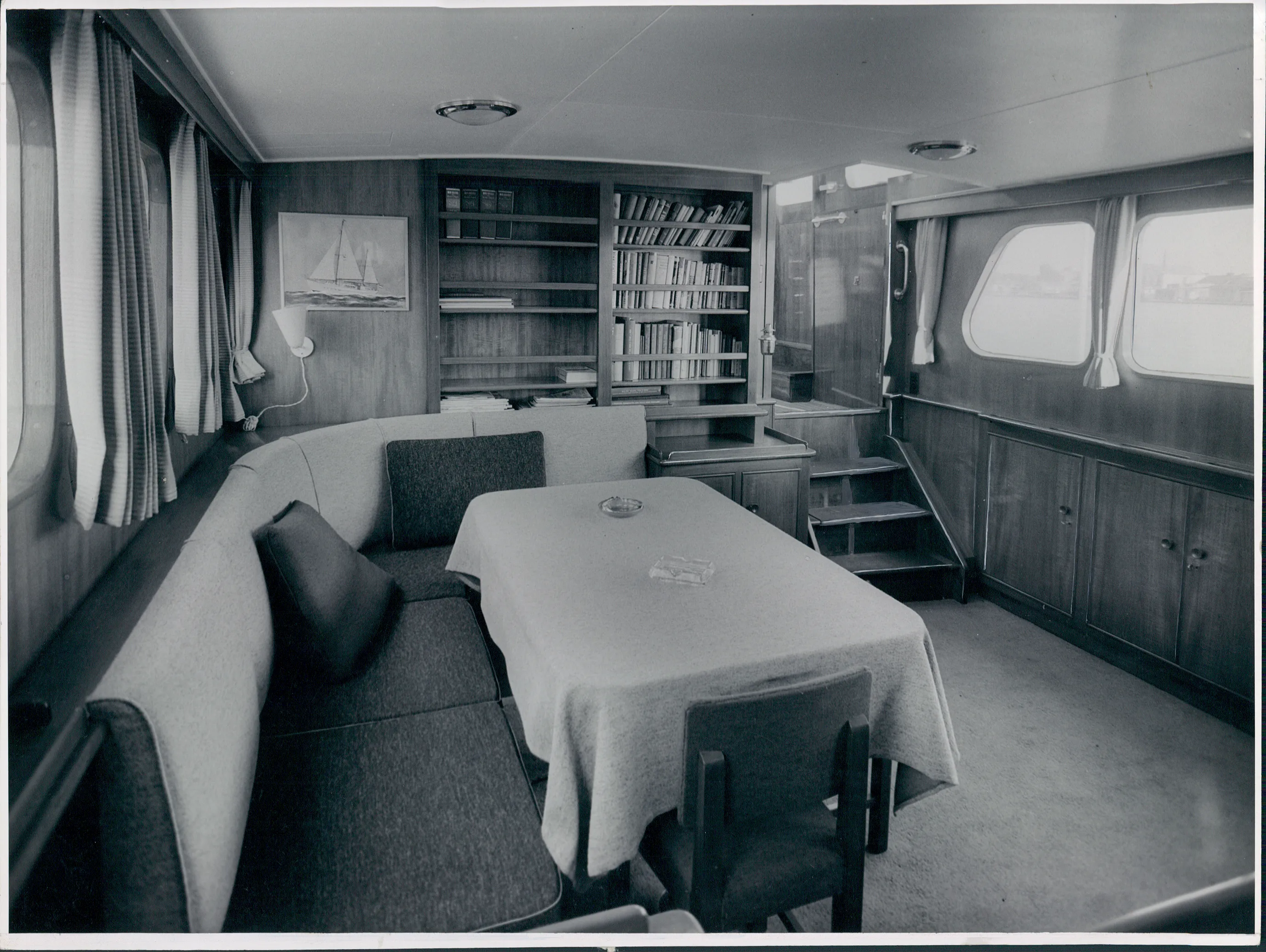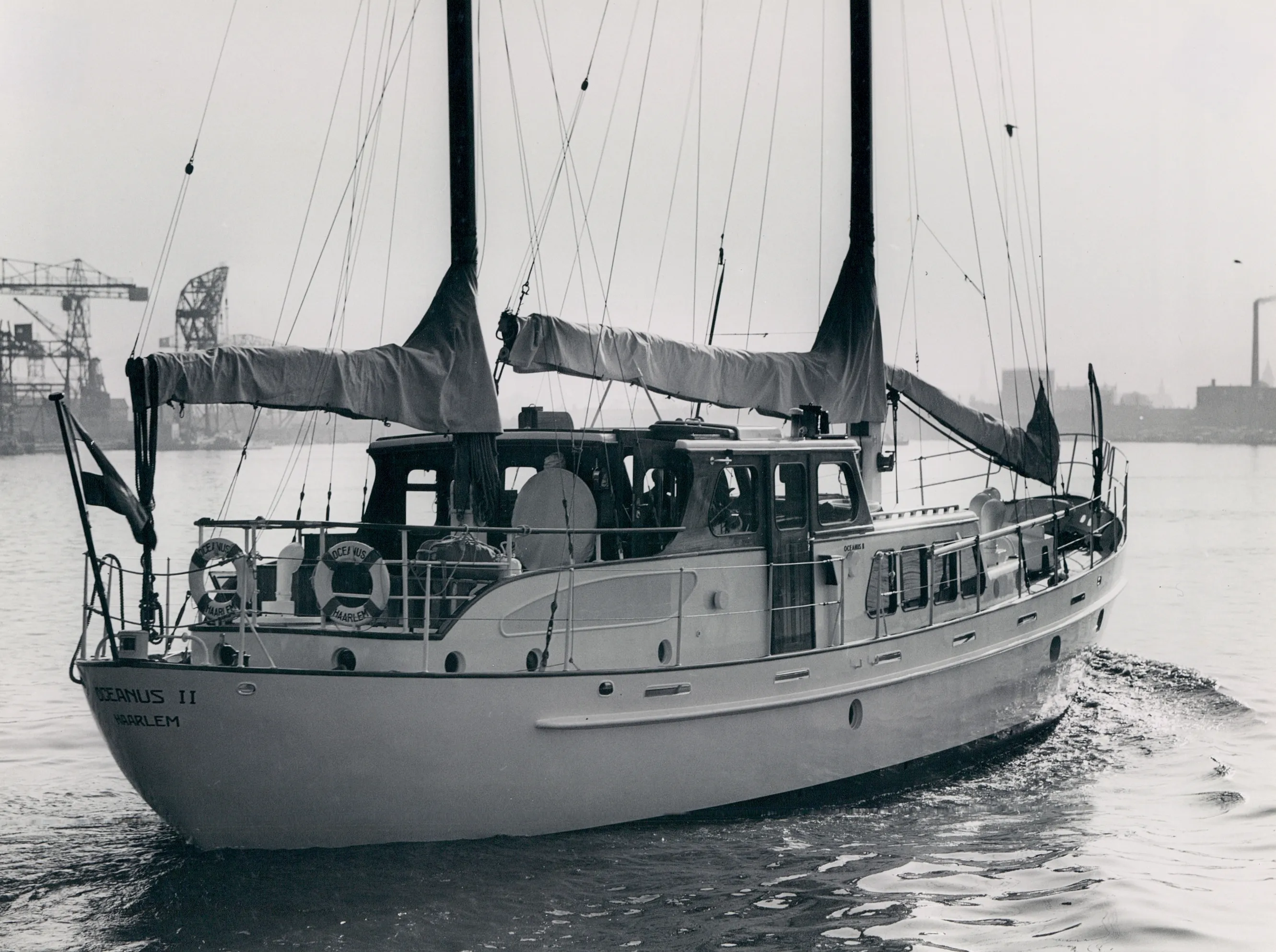 This kit rigged 19.00-metre motor sailing yacht was one of the larger and more powerful sailing yachts built in Aalsmeer, with three cabins and space for 5 guests onboard at the same time. The client was a Dutch industrialist from Beverwijk and the design by H.W. de Voogt. The hull was made of 5 to 6 mm thick steel, the decks of 40 mm teak and the panelling of mahogany and teak. The (auxiliary) engine was a GM diesel, type 6071 and delivered 170 hp. Built under Lloyd’s approval 100 A 1, Oceanus II first sailed extensively through Dutch waters before its new owners transported it to Geneva under the same name.