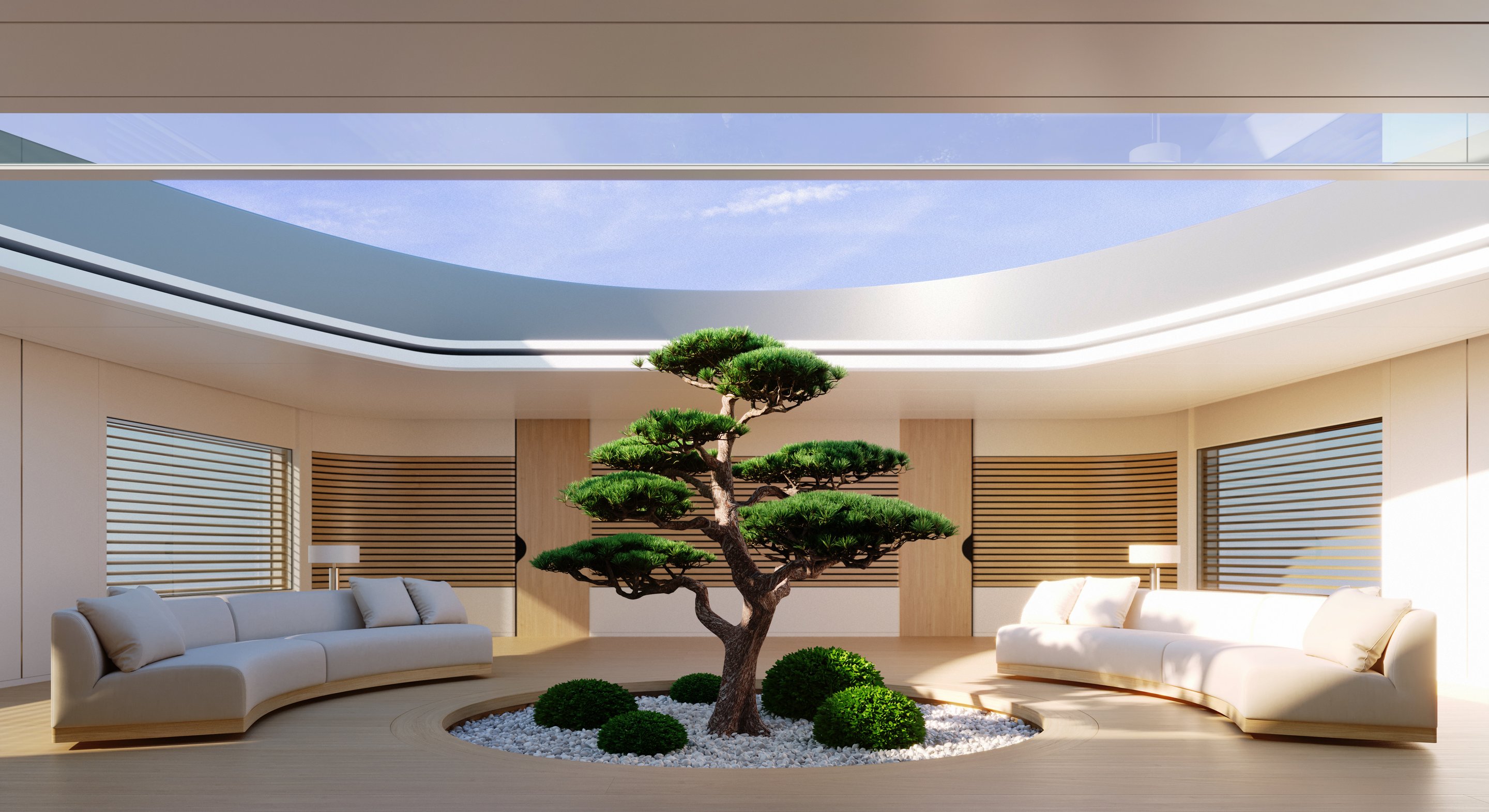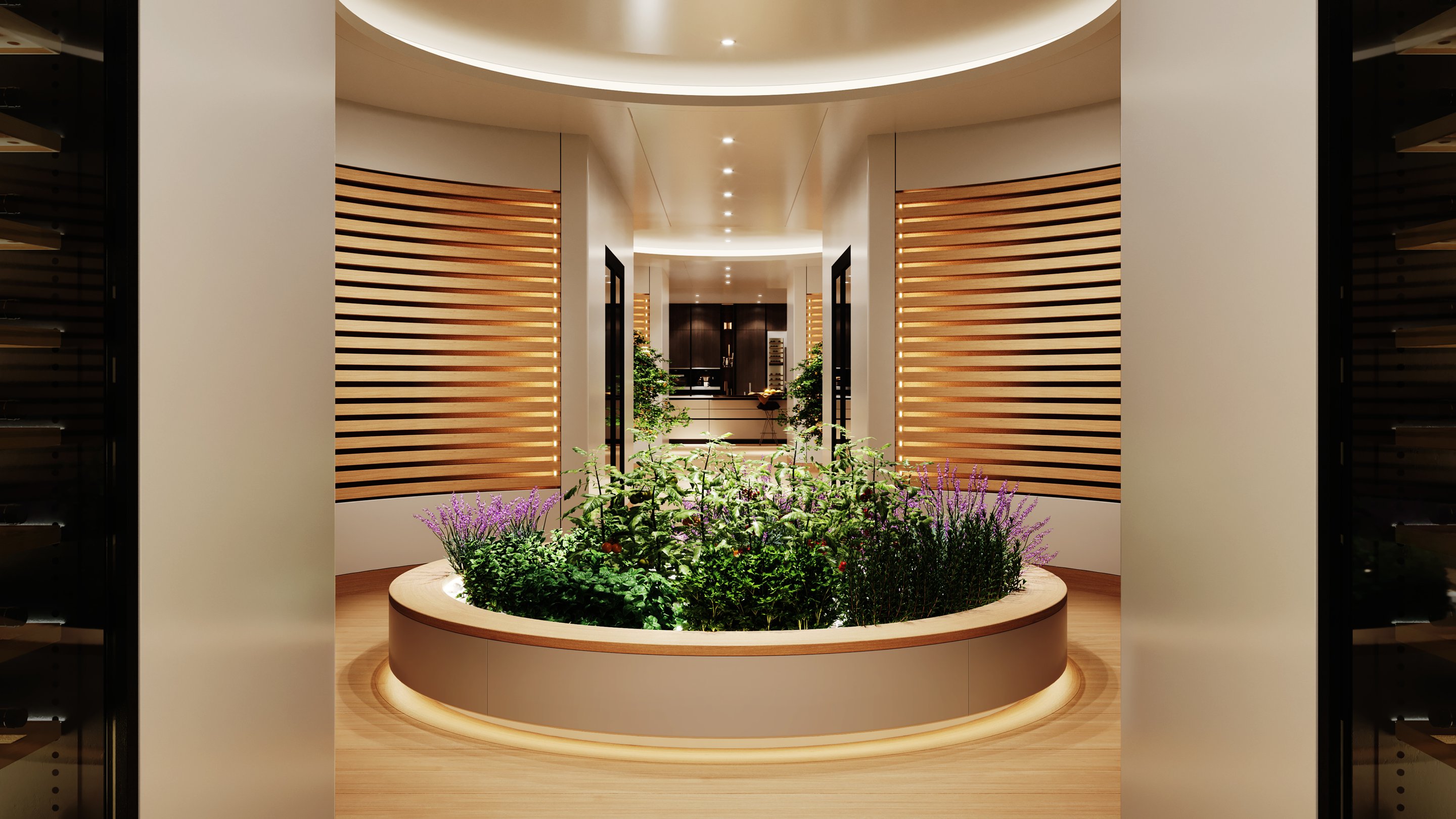 The epicentre of Escape is an amidships atrium that includes a wellness area and a moon pool with seawater which is actually inside the vessel and doubles as a secret submarine landing zone. There’s even a giant slide for inter-deck splashes and a panoramic elevator descending into the sea. The atrium is more than just a visual wow factor: it serves as a place for the owner and his friends to gather, replacing the function traditionally held by lounges.