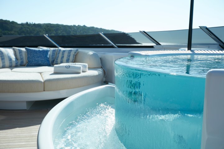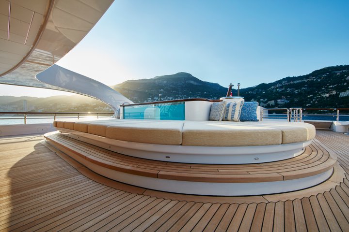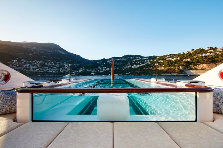 As well as being the first Feadship to surpass the 100-metre mark, Symphony was also the first to sail under the Passenger Yacht Code that allows a vessel to carry up to 36 guests. Earning this distinction requires every single item and material on board to be individually certified for fire resistance by class. Unperturbed, the owner requested close to two hundred different finishes in a harmonious interior that is a masterpiece of artisanal workmanship. Symphony basically has everything, including a beach club whose ceiling is a 6-metre glass-bottom contraflow swimming pool with its own waterfall