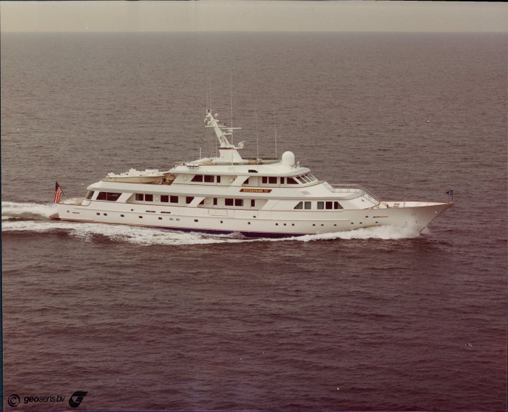 Corporate entertainment was the main theme on Enterprise IV. At 45.37 metres, she was the second Feadship for the Amway Corporation which used their yachts primarily to reward the top sellers of their soap products. Learning from their previous yacht, this larger Enterprise had a transom stern and boarding cockpit to provide more space and greater leisure possibilities for guests, a far larger entertainment area on the main deck and five identically sized, similarly furnished guest staterooms to ensure no conflicts could arise between the incentive-winning salespeople. Enterprise IV had excellent performance parameters and was sailed to Perth, Australia to serve as a spectator boat for the America’s Cup. It wouldn’t be their last Feadship.