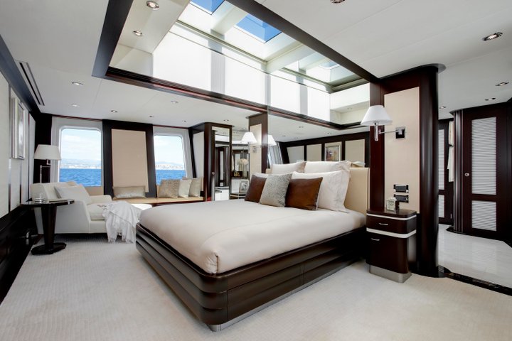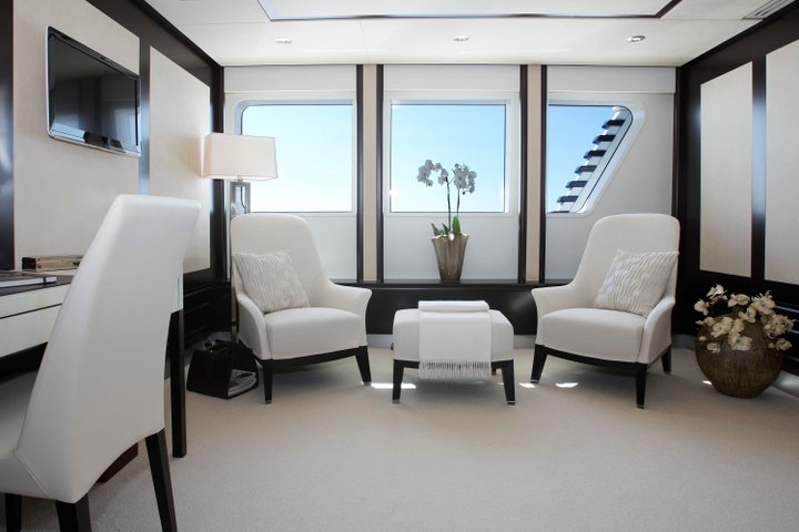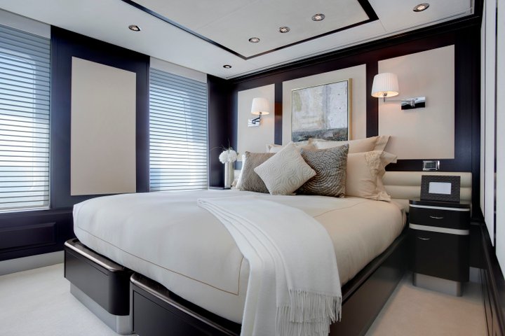 Helix’s interior features a modern mix of light fabric covered walls in mahogany wooden frames and a high contrast in carefully selected materials. Designed by Studio De Voogt and Sinot Yacht Architecture & Design as part of the F45 Vantage series, Helix is an exceptionally sophisticated superyacht in terms of her layout, finish and technologies. She offers a unique layout for a 45-metre yacht, where the guest staterooms and the master staterooms are all located on the main deck for beautiful views from every stateroom.