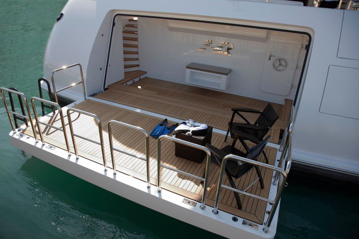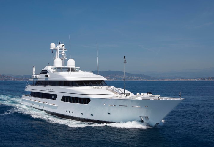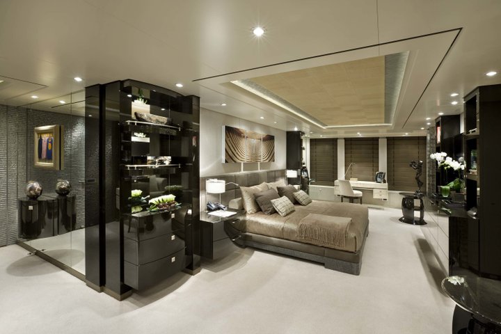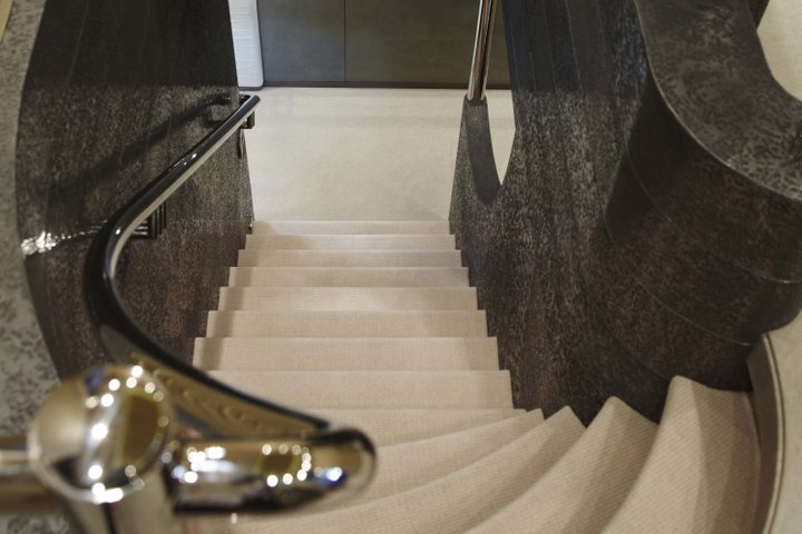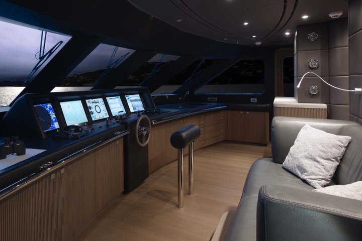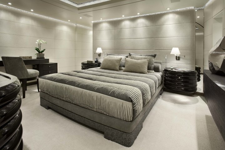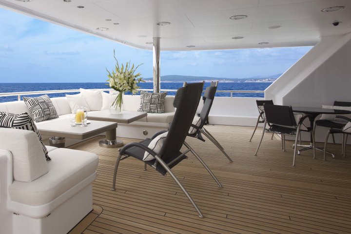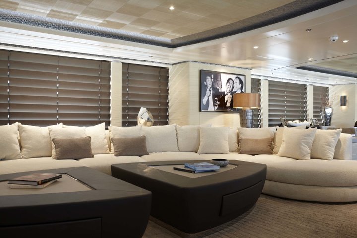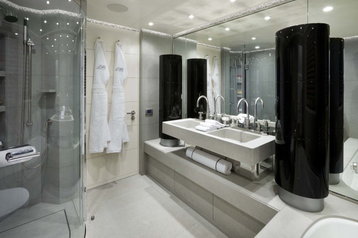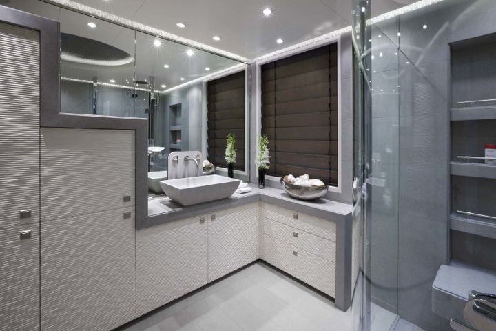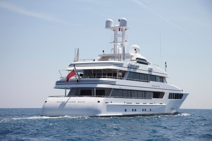 Hurricane Run’s exterior, designed by Studio De Voogt, has a range of distinctive touches, including the anthracite colour along the superstructure, accentuating the yacht’s long lines while separating the various white sections. Silver accents add further elegance, while modern touches are seen in the cap rails and sharp bulwark edges. A long foredeck and sleek lines combine to make this 53.50-metre yacht for a repeat owner (High Chaparral, 2004) seem much larger than her length suggests.