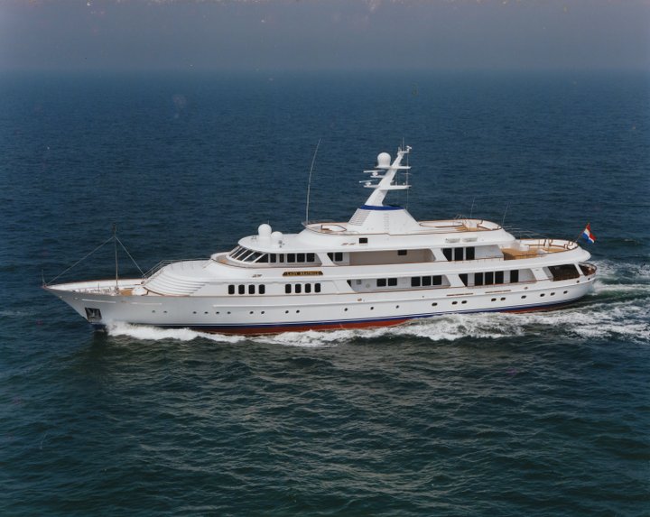 Designed by Studio De Voogt, the 60.00-metre Lady Beatrice is a classic, canoe-sterned yacht that can accommodate up to sixteen guests. Renowned designer Jon Bannenberg is the brains behind her palatial interiors, which sees a "blend of traditional patterns and opulent textures”. Floor-to-ceiling windows fill the main saloon with natural light, whose drawing room aesthetic is cultivated by a grand piano, ambient lighting and pin-striped sofa seating. Adjoining the main saloon is a formal dining area, seating guests under a Renaissance-style fresco ceiling.