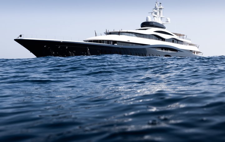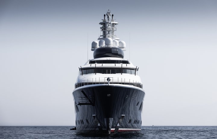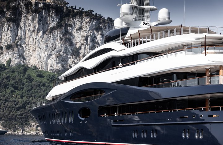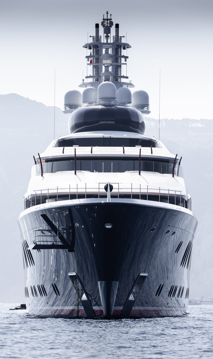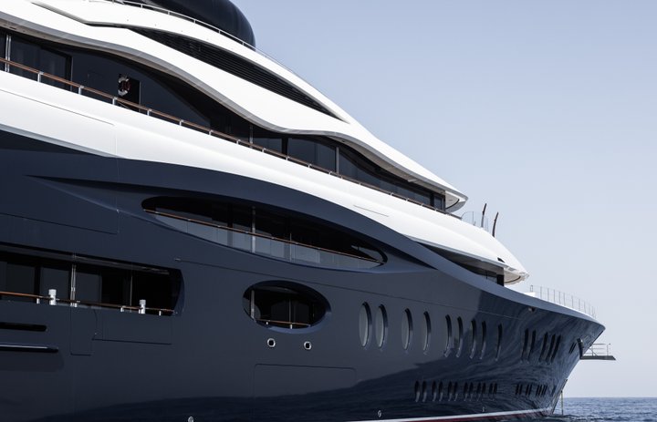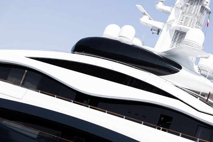 At take-off, LAUNCHPAD was by far the largest yacht Feadship had ever built – an accolade it would retain until 2024. A classically balanced yet edgy and innovative yacht, her unique wavy lines give the impression the Flag Blue hull rises beyond the main deck. Her contours are chamfered to emphasize the sleek white superstructure. A defining feature is the fully enclosed, pod-like observation lounge on the top deck. The curved glass windows in this unusual space offer outstanding forward-facing vistas. Stand-out features include a private outdoor owner’s deck with Jacuzzi; two certified helipads; swimming pool with movable floor; and a spacious beach club.