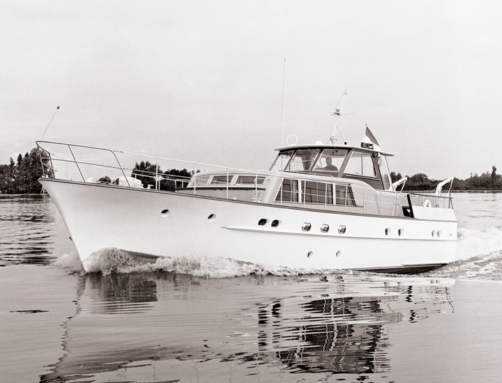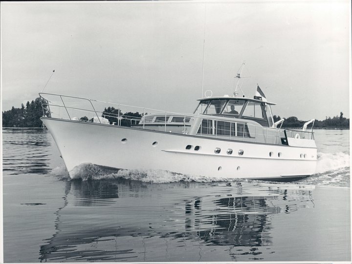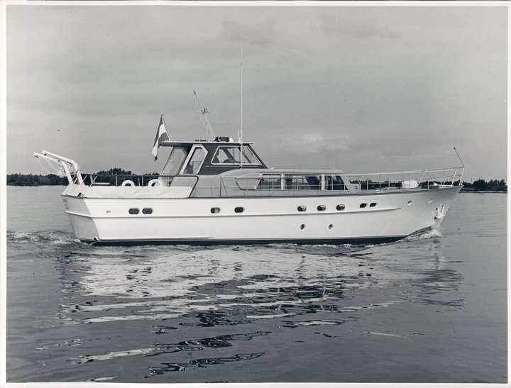 In the 1960s the shipyard in Aalsmeer was experimenting with a number of semi-standard designs and also took on some useful refitting projects on both motor and sail yachts. Johan de Vries prepared a large number of designs for motor and sailing yachts. Several were built on spec. and sold at boat shows, including this 17.26-metre Mi Do II alongside the 19.80-metre Katja (1966) and the 24.50-metre Ale II.