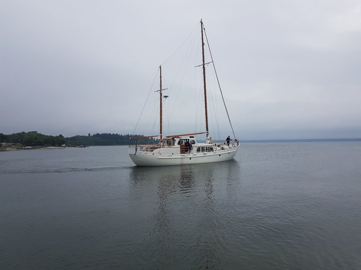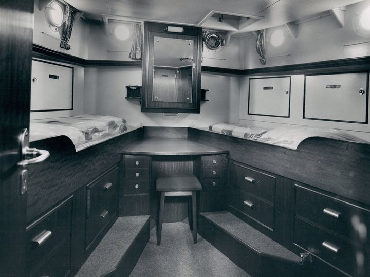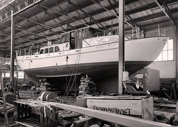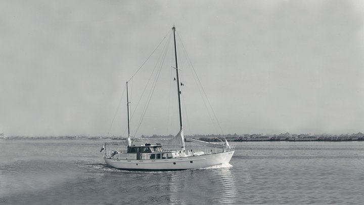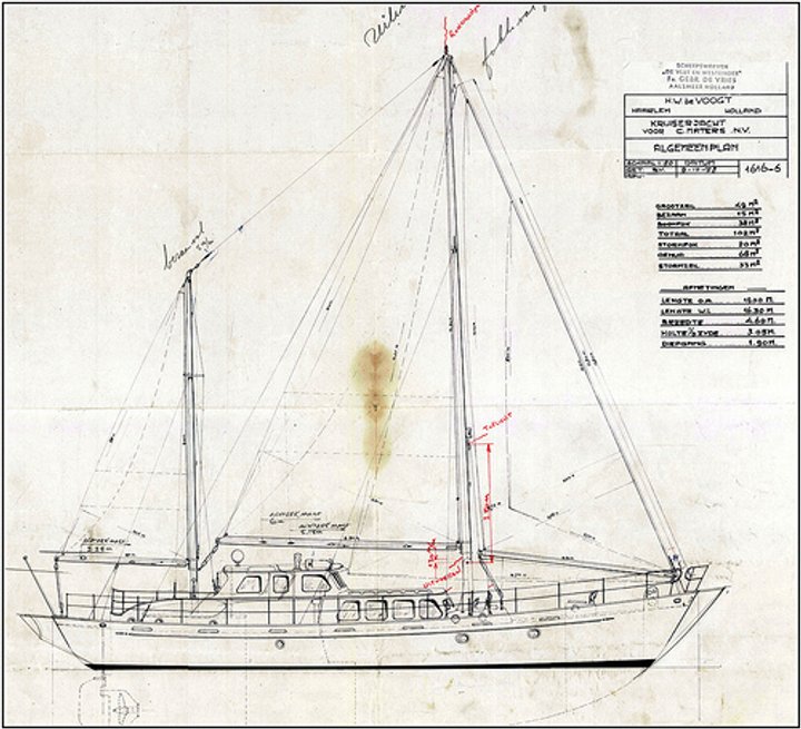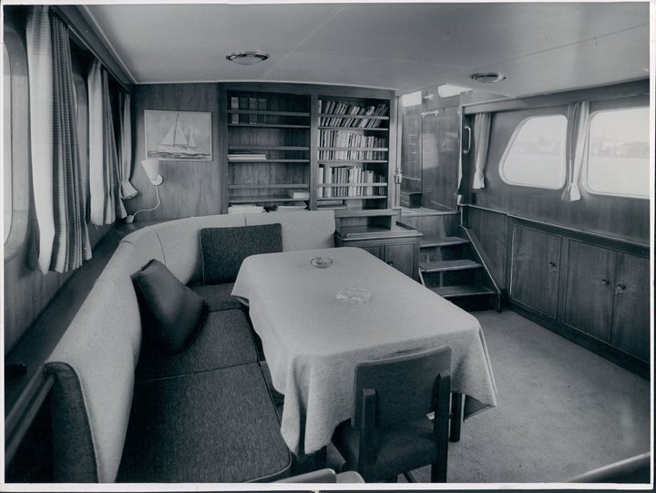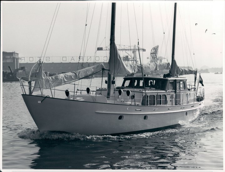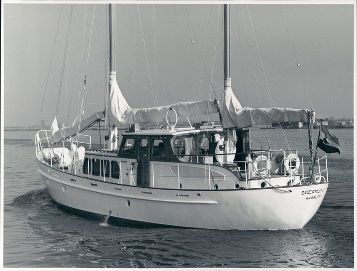 This kit rigged 19.00-metre motor sailing yacht was one of the larger and more powerful sailing yachts built in Aalsmeer, with three cabins and space for 5 guests onboard at the same time. The client was a Dutch industrialist from Beverwijk and the design by H.W. de Voogt. The hull was made of 5 to 6 mm thick steel, the decks of 40 mm teak and the panelling of mahogany and teak. The (auxiliary) engine was a GM diesel, type 6071 and delivered 170 hp. Built under Lloyd’s approval 100 A 1, Oceanus II first sailed extensively through Dutch waters before its new owners transported it to Geneva under the same name.