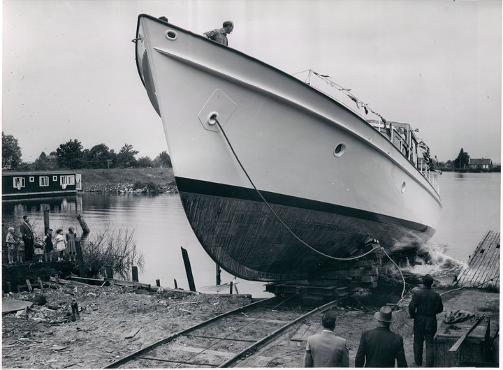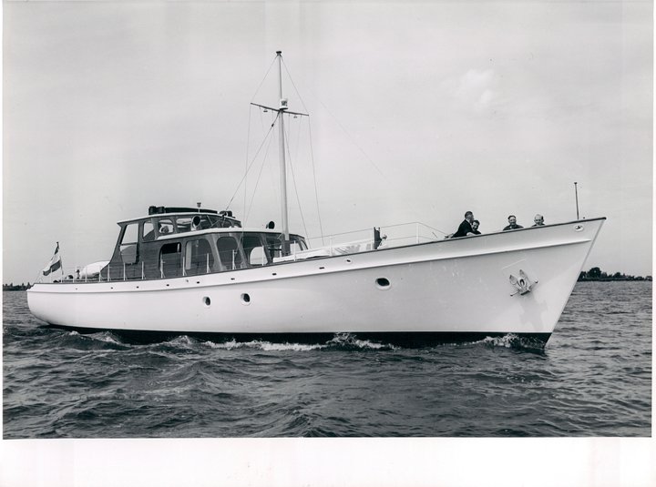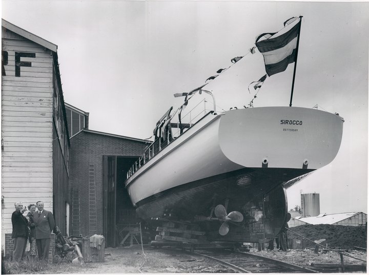 This beautiful yacht was the last large wooden motor yacht built by the shipyard in Aalsmeer; when construction began in July 1958 it heralded the end of traditional timber construction at the shipyard. (Two years earlier, in 1956, the 17.33-metre Zwerver (Wanderer) was the yard’s last large wooden sailing yacht.) The design was by H.W. de Voogt, but Ernst Vossnack from the design agency of Rotterdamsche Lloyd had an important influence on the design as well: The client was the Rotterdam shipowner B.E. Ruys of the Koninklijke Rotterdamsche Lloyd. Sirocco was a composite built, twin-screw wooden motor yacht with an overall length of 25.43-metre and 5.14-metre beam.