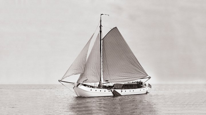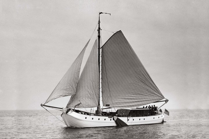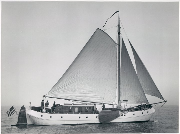 The drawings of De Vrouwe Christina for American professor Crawford F. Failey were made by chef-draughtsman Bastiaan Vermeer from the design bureau of H.W. de Voogt. The 23.04-metre tjalk was made of steel and had a beam of 5.27-metre. The mainsail was 105 m²; and two GM diesels were installed, each of 150 hp. The well-known Dutch sculptor, ceramist and interior architect Anton Fortuin was appointed to create various wooden sculptures for the yacht, including a teak seal to decorate the rudder head and a sculpted dolphin adorned the entrance stairs to the salon. He even applied his art to the yacht’s many doorknobs and handles.