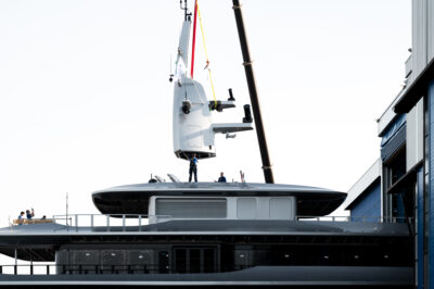 Designed by renowned UK sailing yacht specialist Malcolm McKeon, Project 826's low and clear profile is set to redefine the genre. Long and sleek, you will notice immediately her low freeboard and the uncluttered, flat foredeck. Her 80.00-metre graphite-coloured hull reveals a slight tumble home before the waterfall teak stern captures your attention. With just two decks above main, she is well-proportioned. Her silver superstructure floats atop full-height glass walls, their views scarcely interrupted by glass bulwarks and balustrades. Shiny black accent panels, teak decks, and warm, vertical teak strips accenting the superstructure create a special signature. If the way she looks as one with the water triggers thoughts of sailing yachts, that is no accident. McKeon has designed more than 200 yachts, 55 of them in the superyacht range, and most of them sailing yachts.