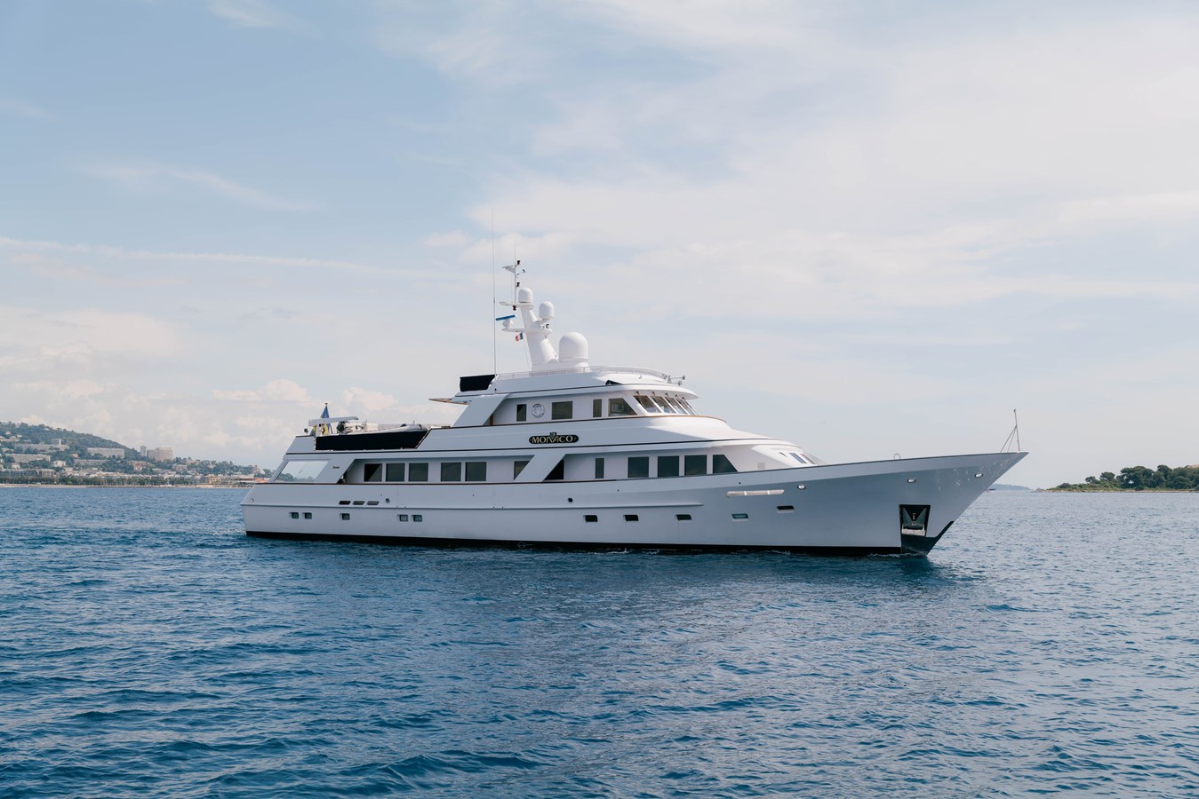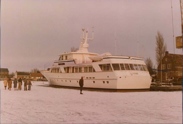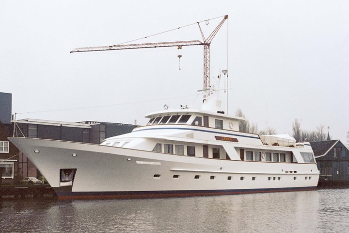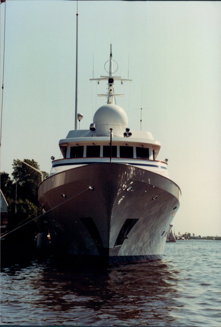 Launched during a Dutch winter so cold workers skated to the yard at Kaag, Arkan showed clear evolution of styling from predecessors such as Enterprise III and Karina C. Long gone was the fantail stern, although the aft main deck remained well covered and could be enclosed in bad weather. The 37.95-metre Arkan changed hands in 1998 and was renamed Matanthar. When that owner upgraded to the 45.70-metre Carmac VII, this yacht was sold and renamed Monaco. As Monaco, this petit Feadship with a maindeck owner’s stateroom was a very active charter yacht.