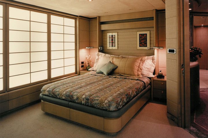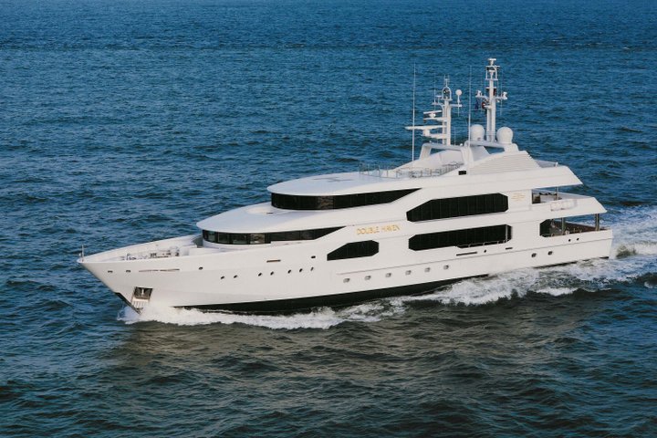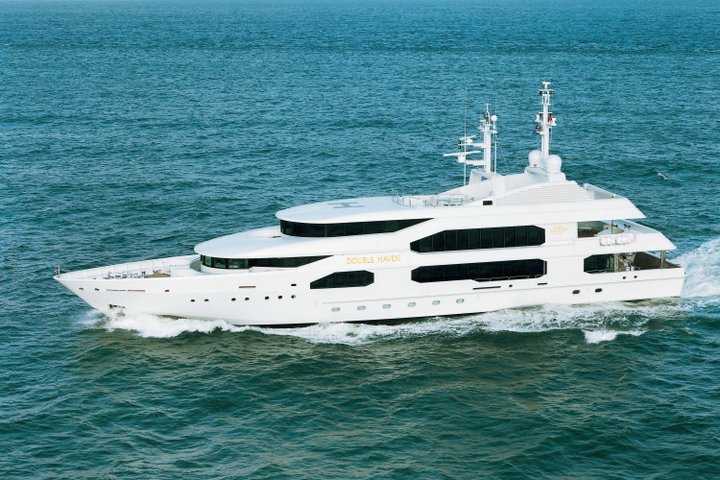 Double Haven is a voluminous yacht with an interior space of enormous capacity thanks to its full-beam use. Her unique aft deck transforms the tender bay into a water sports activity centre with seamless access to the aft lounge on the main deck. Uniquely, the upper level was designed as a luxurious, self-contained apartment with balcony, bathroom and private lounge for the original owners who lived onboard for extended periods of time.